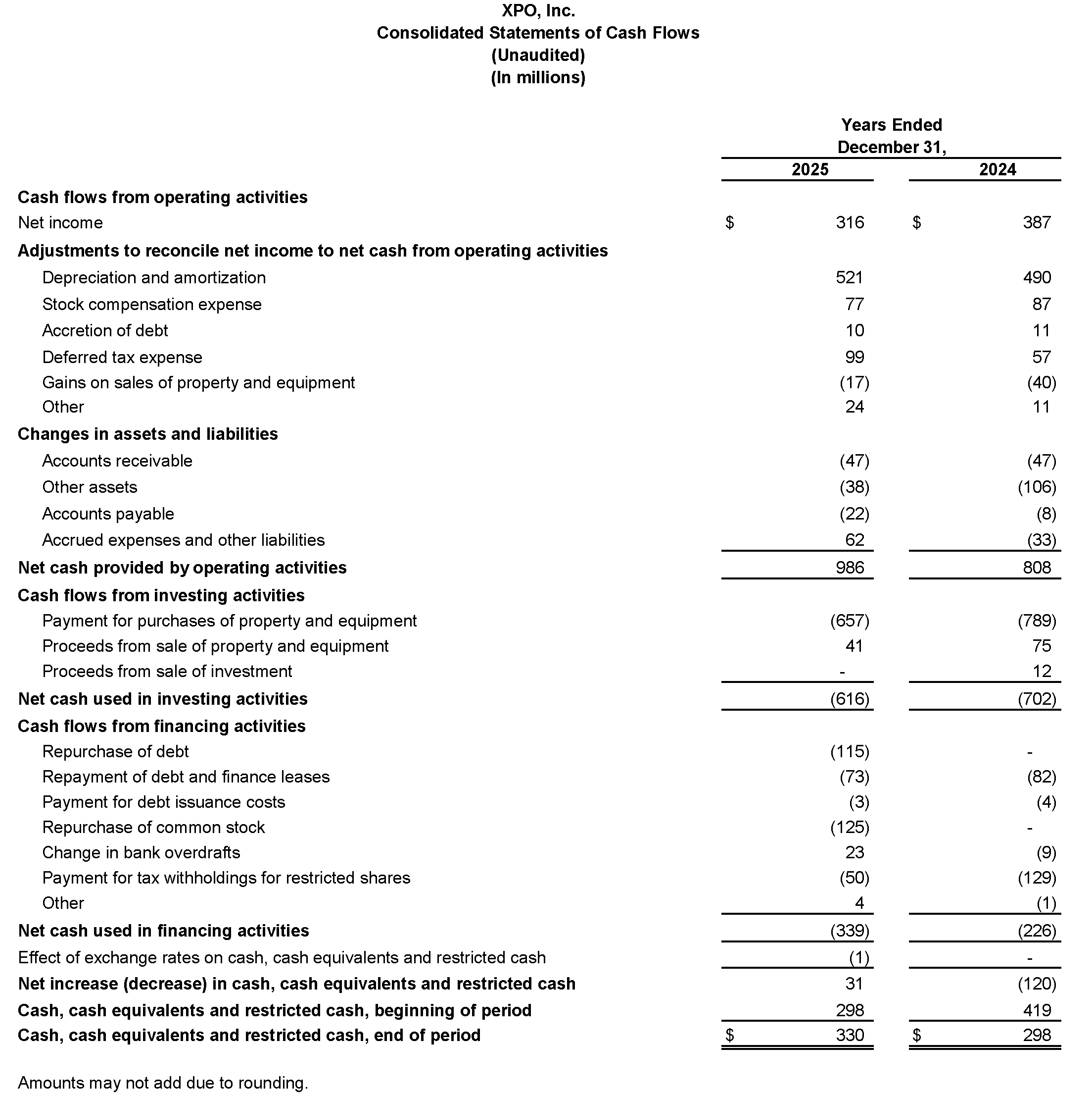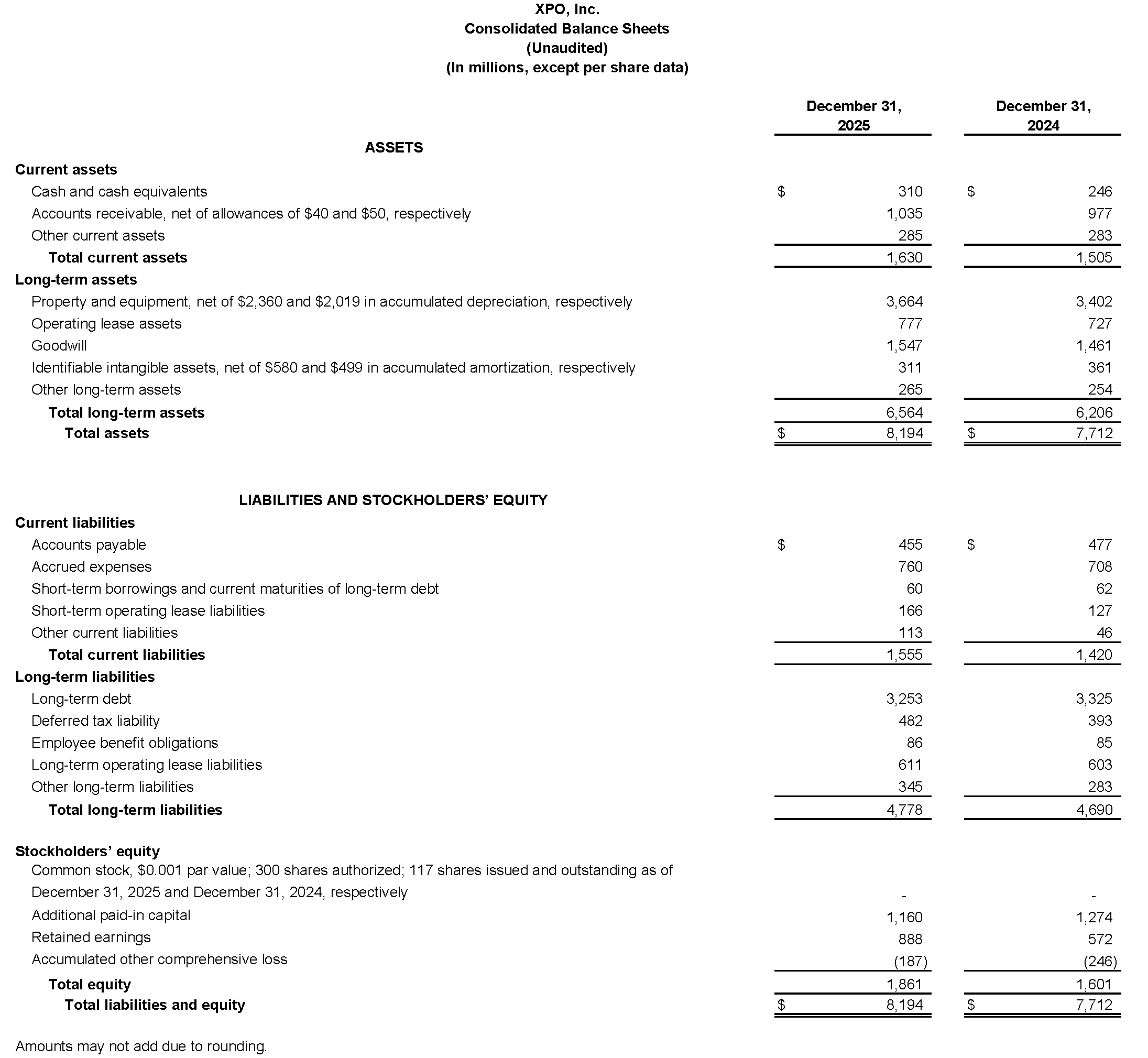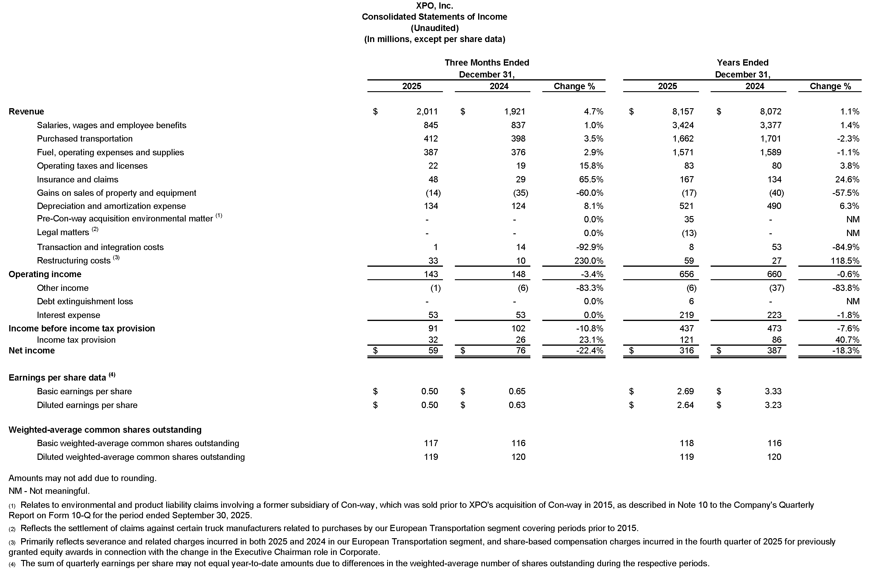 XPO (NYSE: XPO) today announced its financial results for the fourth quarter 2025. The company reported diluted earnings per share of $0.50, compared with $0.63 for the same period in 2024, and adjusted diluted earnings per share of $0.88, compared with $0.89 for the same period in 2024.