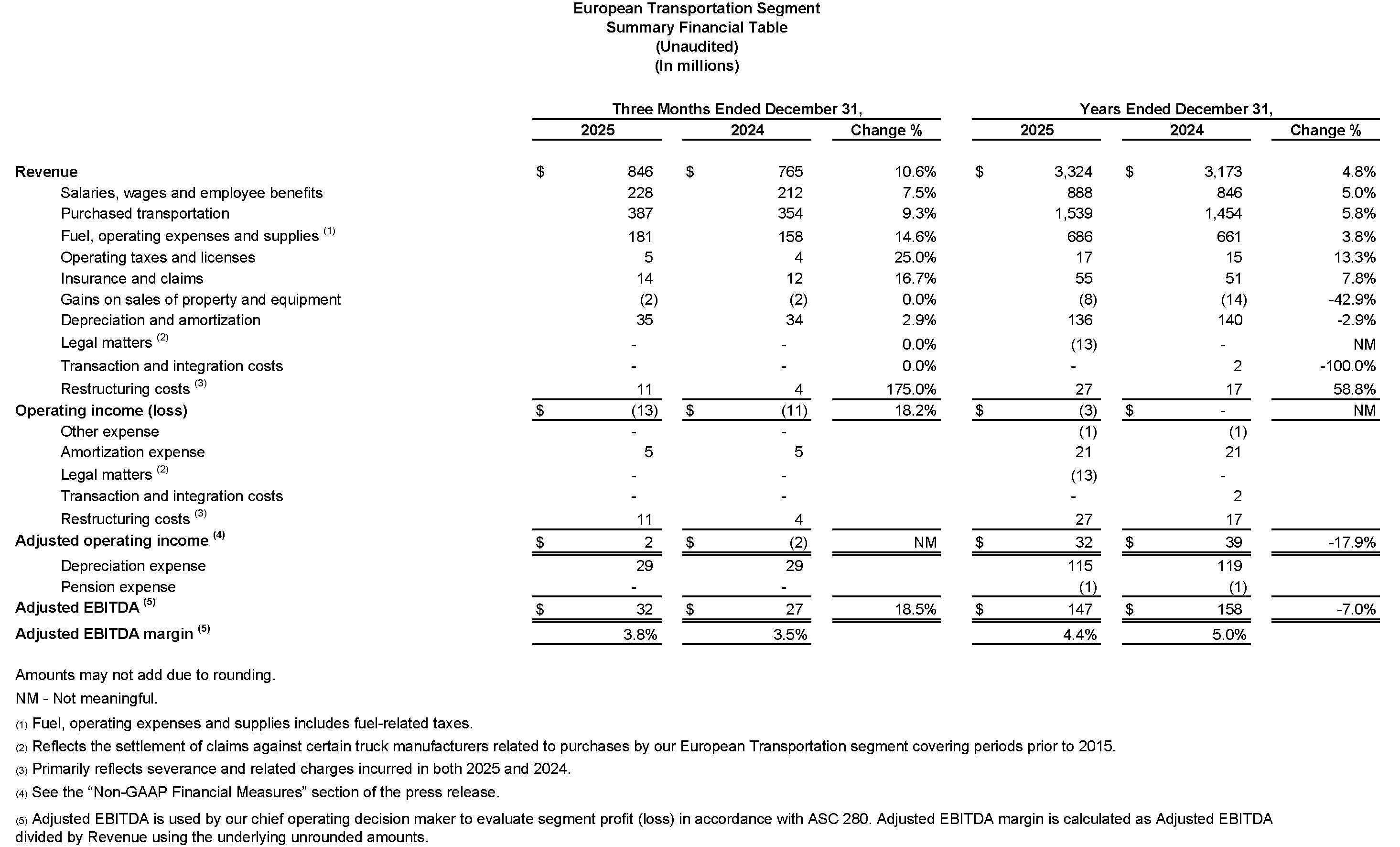 • European Transportation: The segment generated revenue of $846 million for the fourth quarter 2025, compared with $765 million for the same period in 2024. Operating income was a loss of $13 million for the fourth quarter, compared with a loss of $11 million for the same period in 2024.