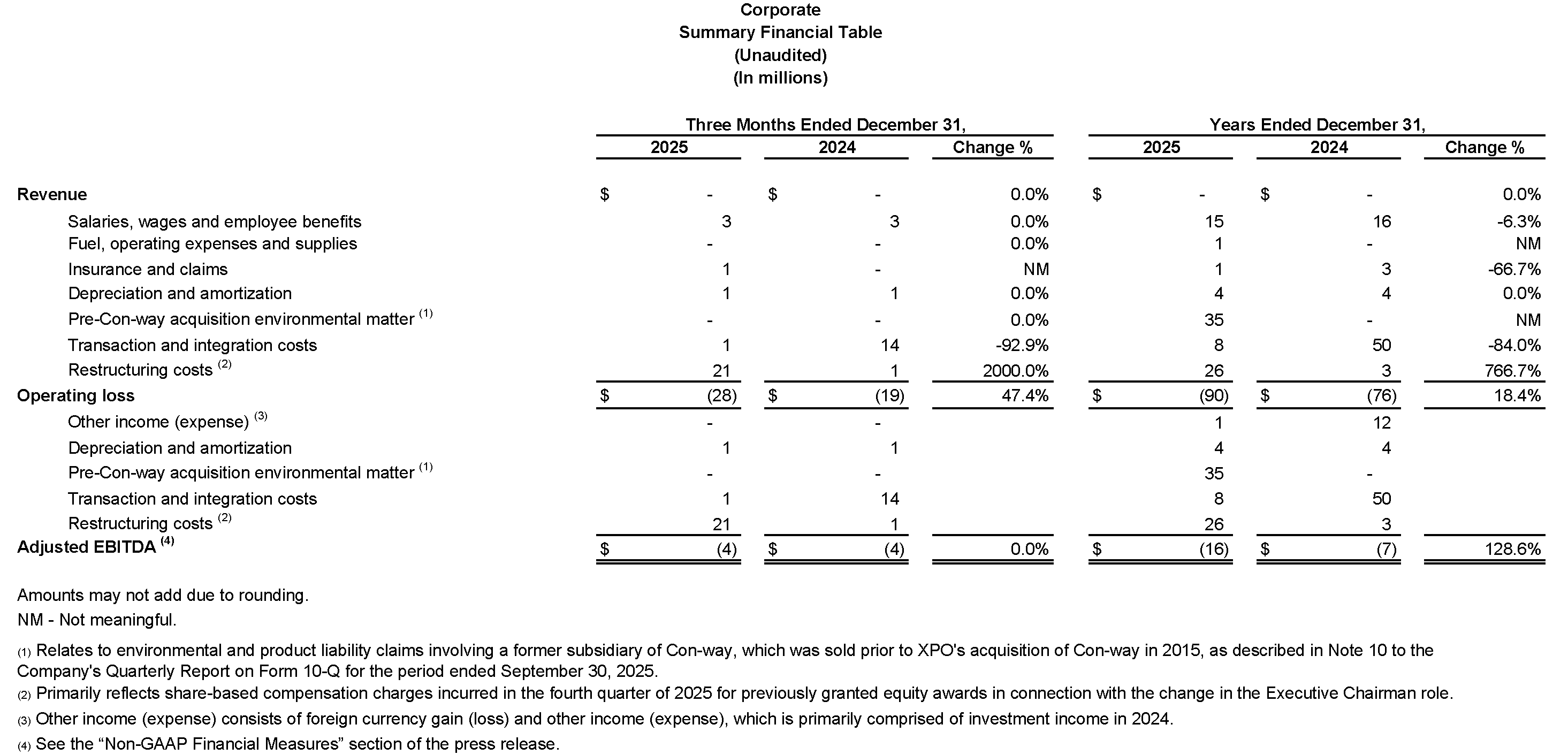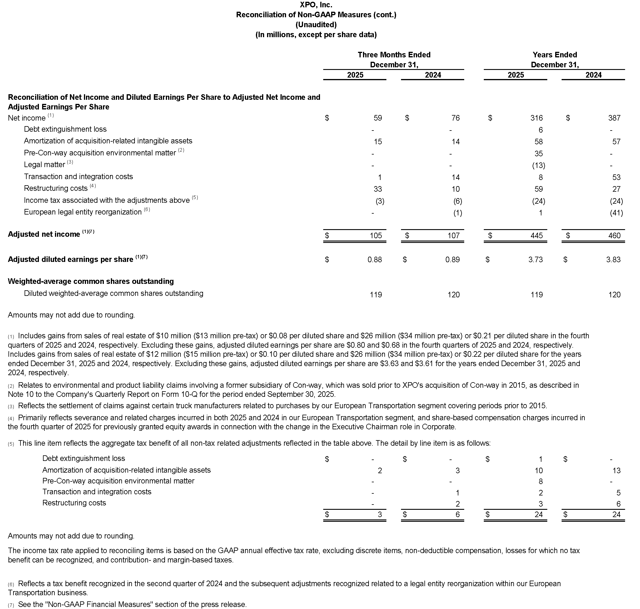XPO’s non-GAAP financial measures in this press release include: adjusted earnings before interest, taxes, depreciation and amortization (“adjusted EBITDA”) on a consolidated basis and for corporate; adjusted EBITDA margin on a consolidated basis; adjusted EBITDA, excluding gains on real estate transactions on a consolidated basis and for our North American Less-Than-Truckload segment; adjusted net income; adjusted diluted earnings per share (“adjusted diluted EPS”); adjusted diluted EPS, excluding gains on real estate transactions; adjusted operating income for our North American Less-Than-Truckload and European Transportation segments; and adjusted operating ratio for our North American Less-Than-Truckload segment.