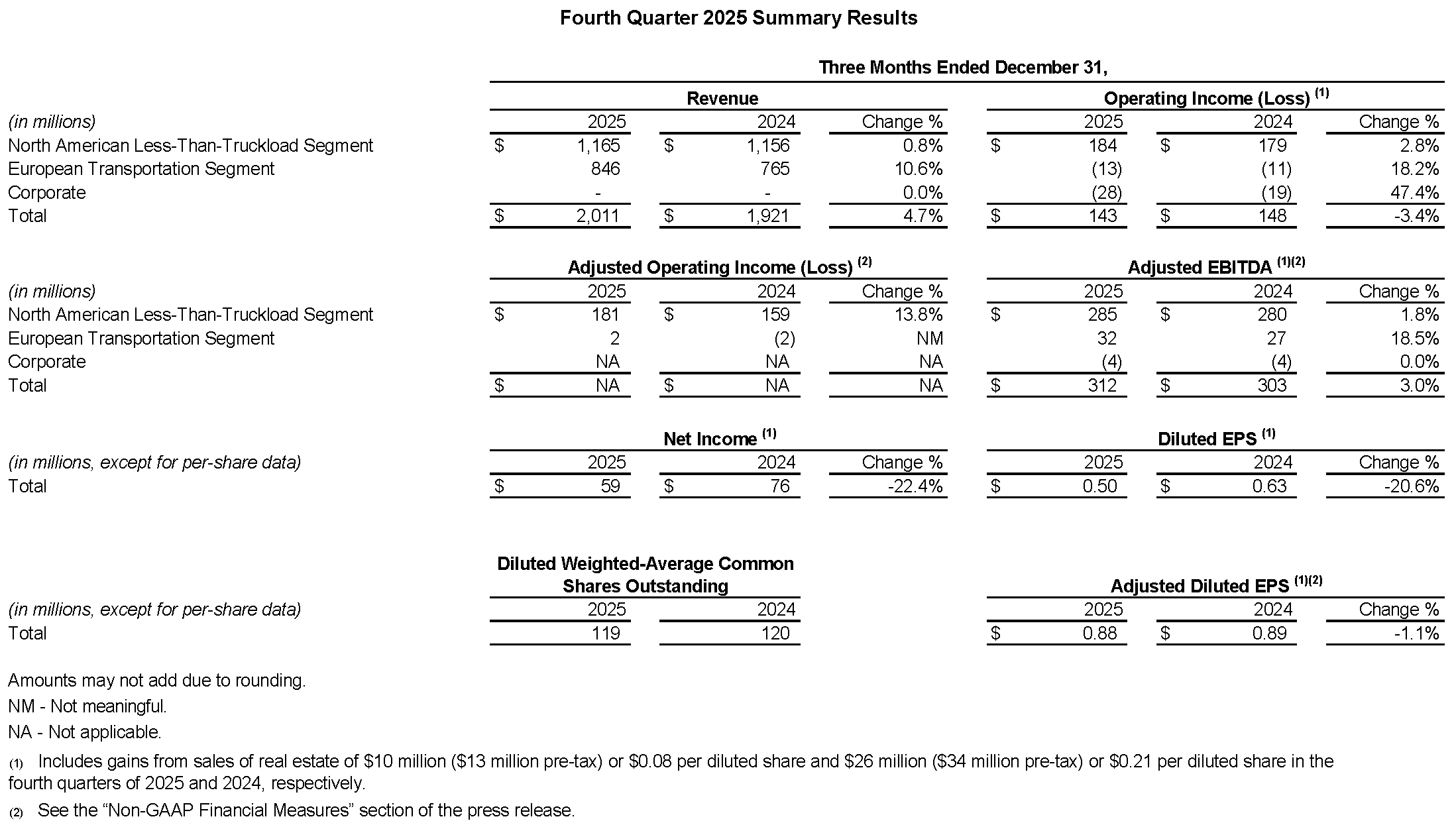 • North American Less-Than-Truckload (LTL): The segment generated revenue of $1.17 billion for the fourth quarter 2025, compared with $1.16 billion for the same period in 2024. On a year-over-year basis, yield, excluding fuel, increased 5.2%, while shipments per day decreased 1.6%, and tonnage per day decreased 4.5%.